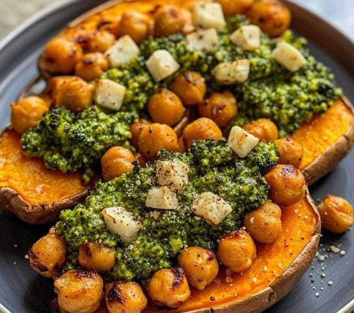 6. Assemble: Once the sweet potatoes are done, remove them from the oven and mash the flesh slightly while still in the skin. Top each sweet potato with the roasted chickpeas, then add a generous spoonful of the broccoli pesto on top.