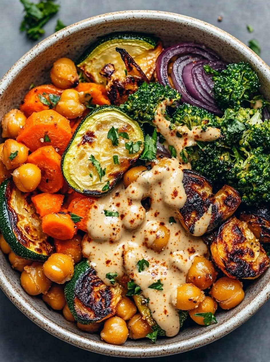 Roasted Vegetable & Chickpea Bowl with Maple Dijon Tahini Dressing