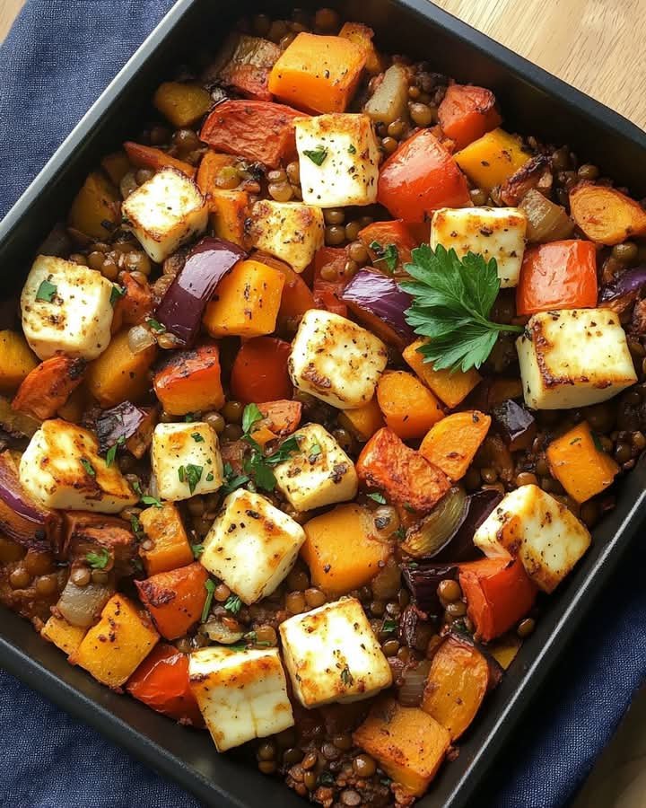 Sure! Here’s a complete recipe for Roasted Vegetable Tray Bake with Lentils and Halloumi, including a description, step-by-step instructions, nutritional information, cooking time, and a Q&A section for common questions.