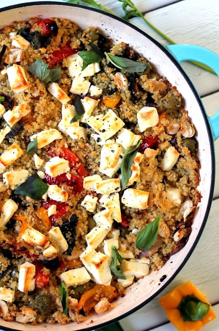 A wholesome Mediterranean-inspired casserole with fluffy quinoa, caramelized vegetables, creamy feta, herbs, and a light lemon-garlic dressing.