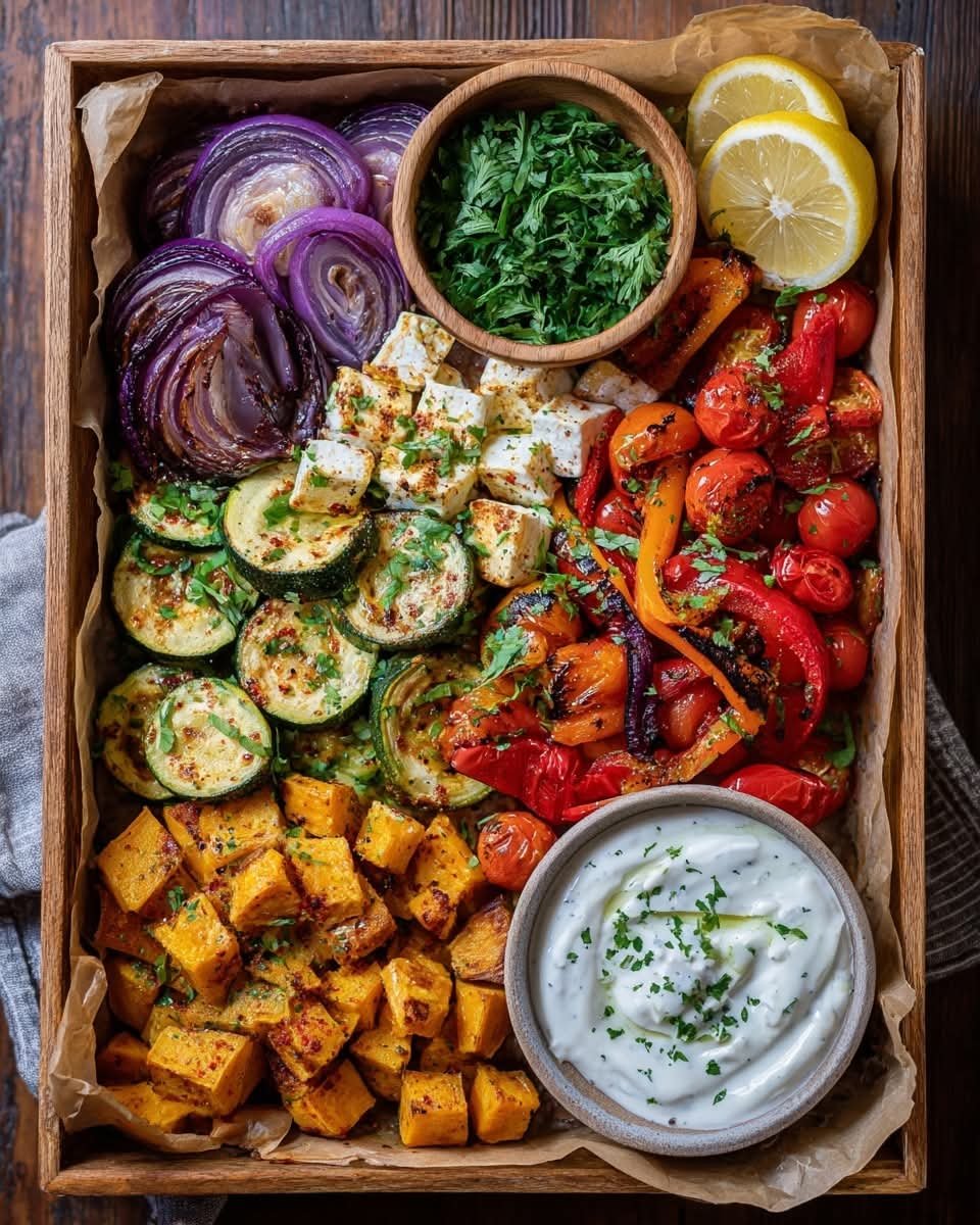 This sheet-pan meal is a simple, vibrant Mediterranean dish featuring roasted seasonal vegetables, caramelized for natural sweetness, topped with crumbled feta, and finished with a creamy lemon yogurt sauce. It’s healthy, customizable, and makes an excellent side dish or light main.