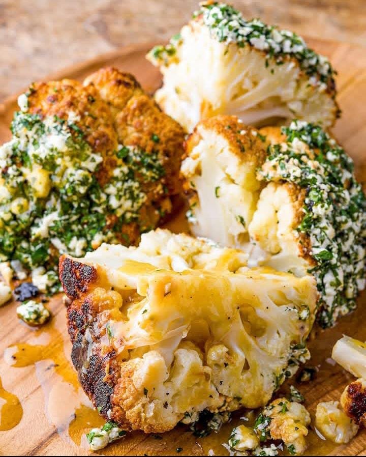 Roasted whole cauliflower with feta is a stunning centerpiece dish that combines crispy, golden-brown edges with a tender, melt-in-your-mouth interior. The cauliflower is seasoned and roasted until beautifully caramelized, then topped with creamy, slightly tangy feta cheese that melts slightly over the warm surface. It’s perfect as a vegetarian main or a flavorful side dish for any occasion.