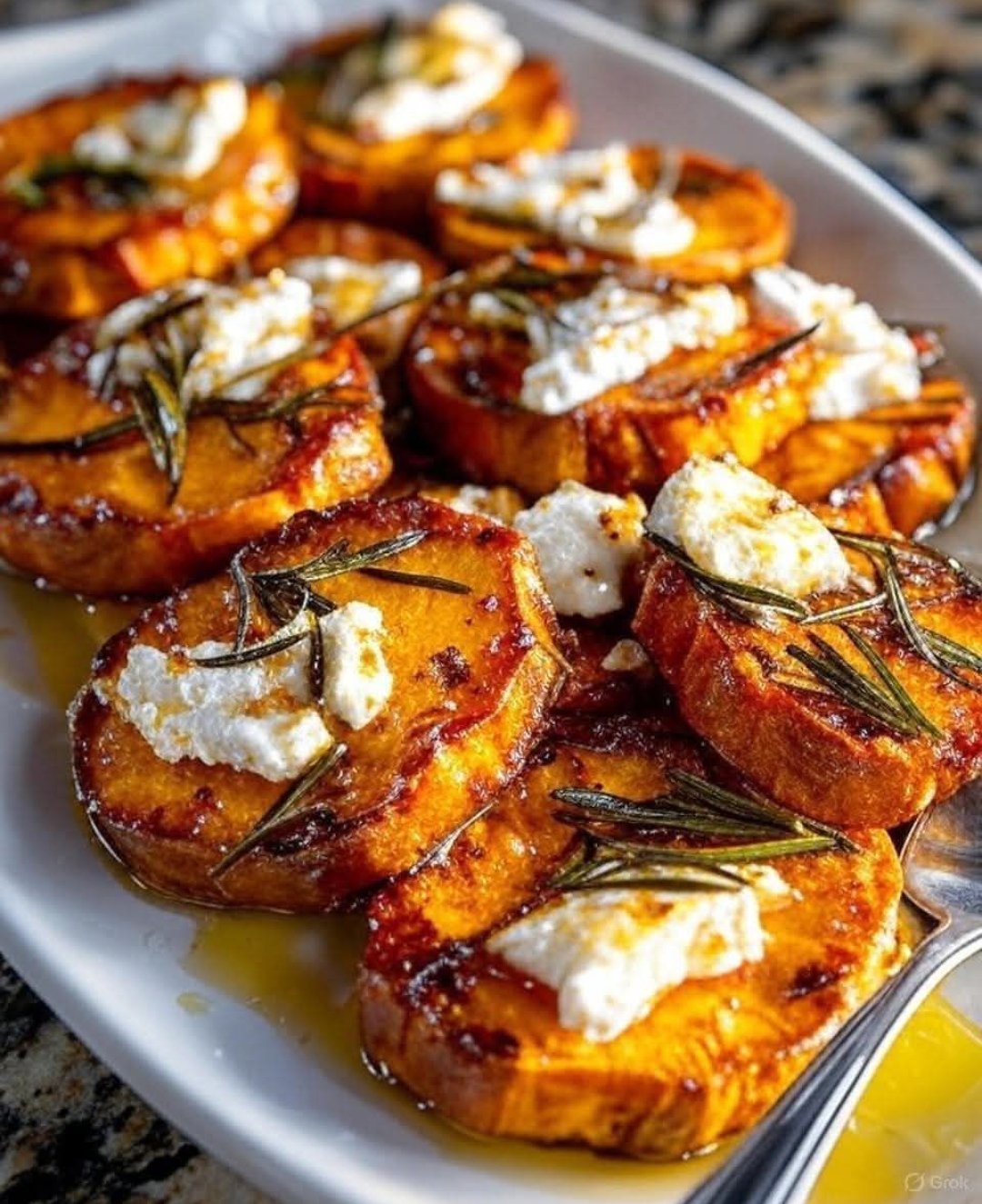 Crispy roasted sweet potato rounds infused with rosemary, topped with creamy burrata and finished with a warm honey drizzle. Sweet, savory, creamy, and herbaceous — a true crowd-pleaser.