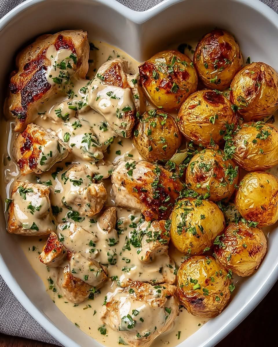Rustic Cream Sauce Chicken is a comforting dish made with tender pan-seared chicken simmered in a rich garlic herb cream sauce. It’s served with crispy herb-roasted potatoes that add a delicious golden crunch. Perfect for family dinners, weekend meals, or special occasions.