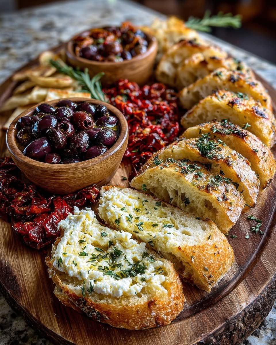 This Rustic Mediterranean Bread and Roasted Garlic Feta Board is a warm, crowd-pleasing appetizer inspired by flavors from the Mediterranean coast. It features crusty artisan bread, creamy roasted garlic feta, olives, fresh vegetables, and a drizzle of olive oil and herbs.