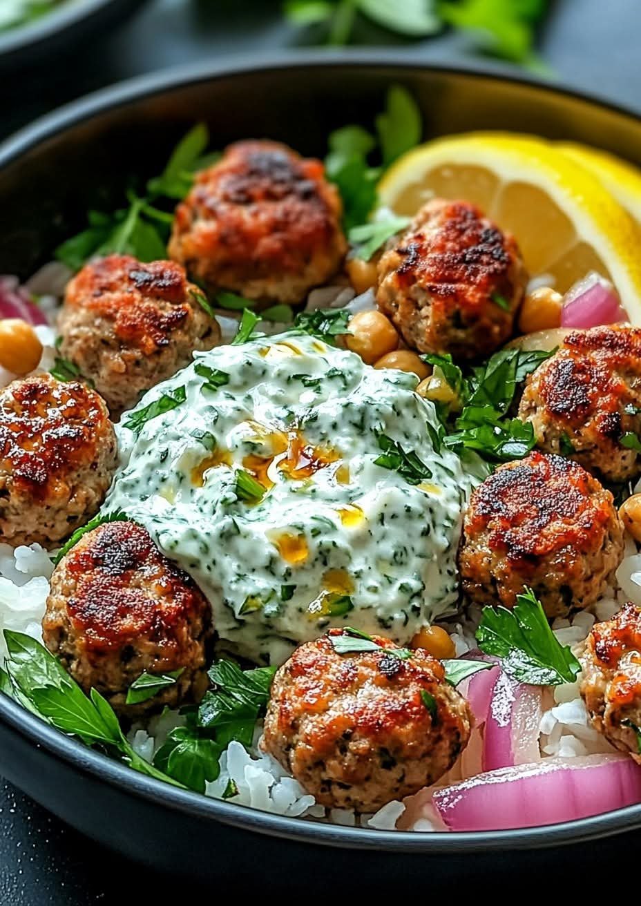 A: You can prepare the meatballs, tzatziki, and roasted vegetables ahead of time. Assemble the bowls just before serving for the best texture and flavor.