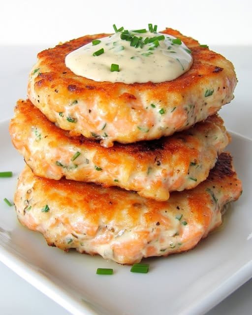 Serve the salmon cakes warm with the garlic sauce on the side for dipping.