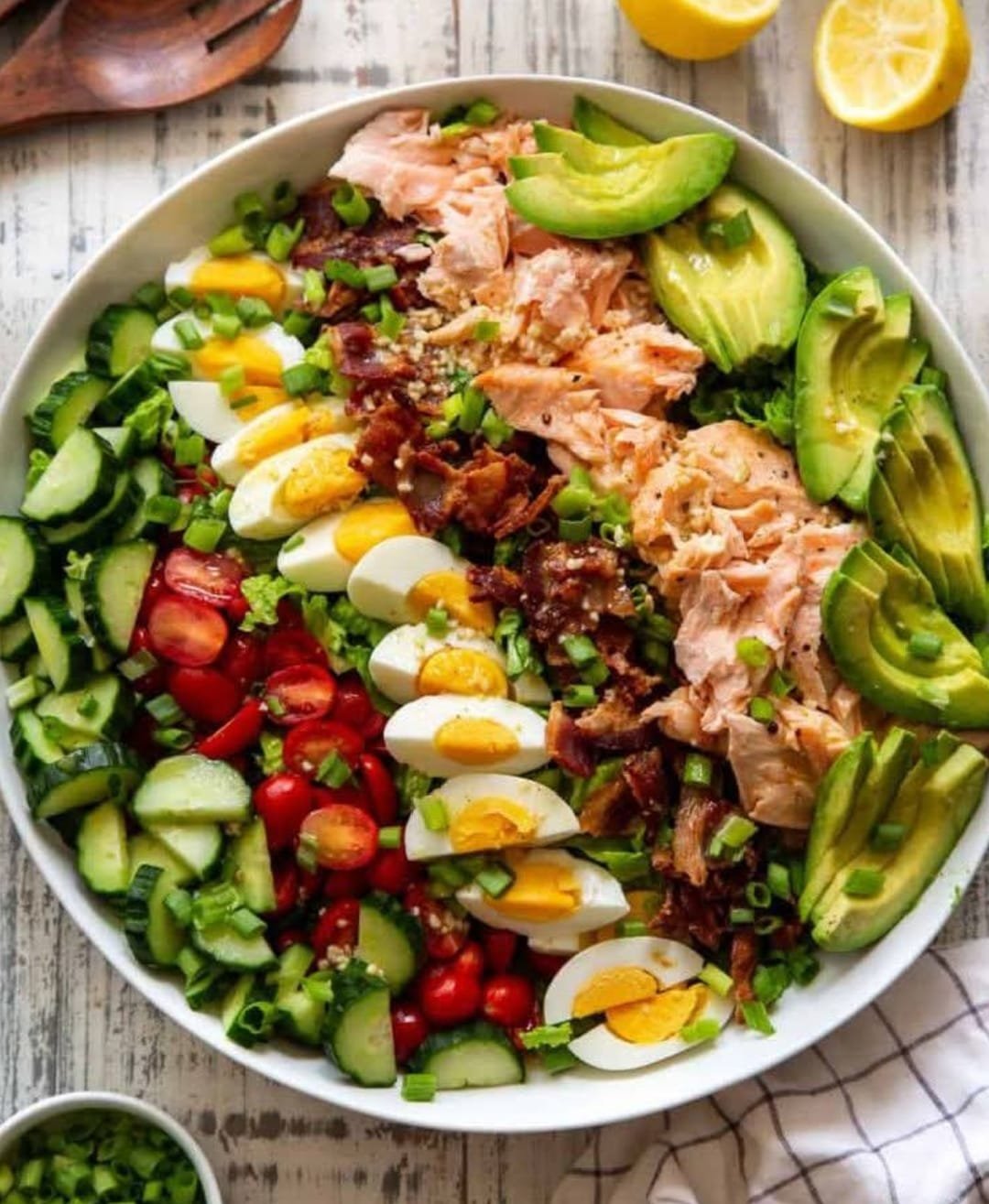 Salmon Cobb Salad is a delicious, protein-packed twist on the classic Cobb salad. It features flaky roasted salmon, crispy bacon, creamy avocado, hard-boiled eggs, and fresh vegetables, all tossed in a flavorful dressing. This dish is perfect for a healthy lunch or dinner, providing a balance of healthy fats, protein, and fiber.
