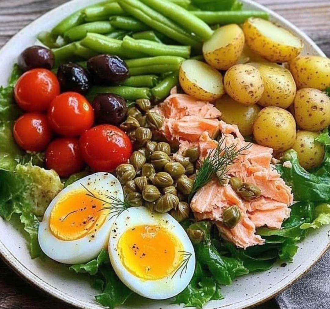 This Salmon Nicoise Salad is a vibrant, protein-packed meal featuring flaky roasted salmon, tender potatoes, crisp green beans, juicy tomatoes, and hard-boiled eggs, all tossed in a light and zesty Dijon vinaigrette. Inspired by the classic French Nicoise salad, this version swaps traditional tuna for salmon, adding rich omega-3s and extra flavor. Perfect for a healthy lunch, elegant dinner, or meal prep option!