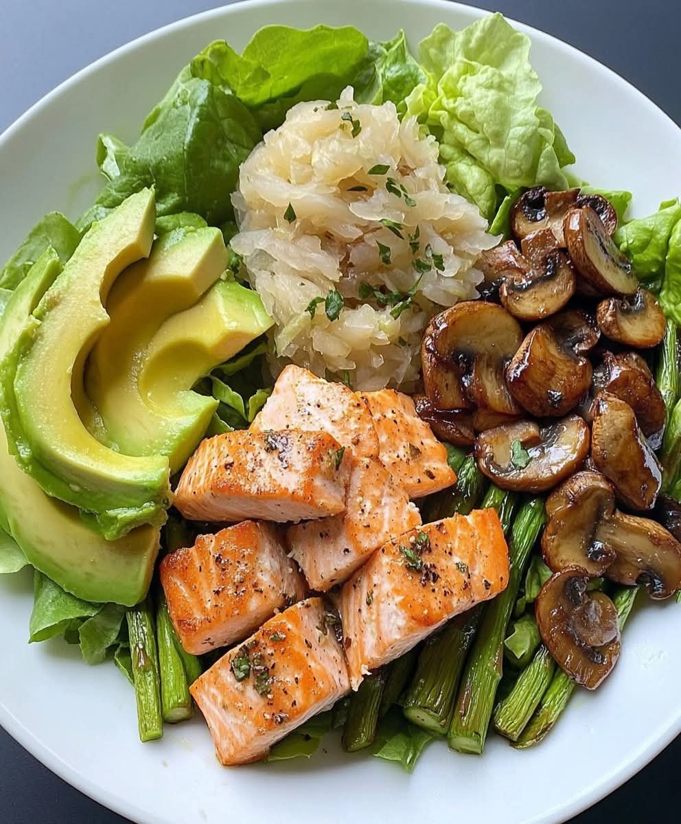 A nutrient-rich, gut-friendly, flavor-loaded bowl featuring tender baked salmon, crisp asparagus, buttery avocado, sautéed mushrooms, and tangy sauerkraut all served over fresh greens. Clean, balanced, and packed with vitamins, protein, and healthy fats.