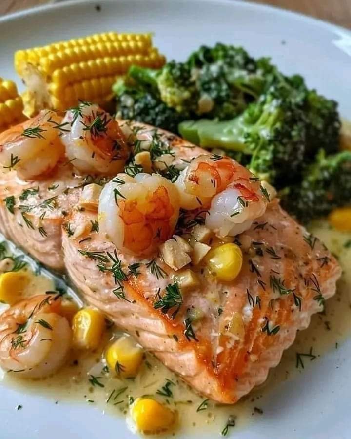 Indulge in a flavorful and nutritious seafood extravaganza, combining pan-seared salmon and succulent shrimp with a creamy, cheesy broccoli and corn medley. This satisfying dish showcases the best of the ocean’s bounty, paired with a comforting and healthy vegetable blend.