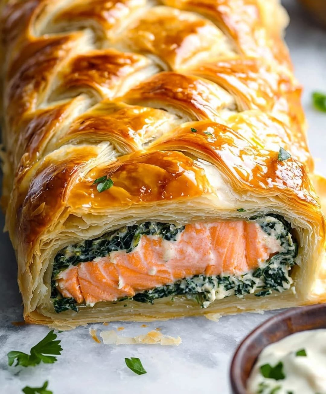 Bake in the preheated oven for 25–30 minutes, or until the pastry is golden brown and flaky, and the salmon is cooked through (internal temperature of 145°F or 63°C).