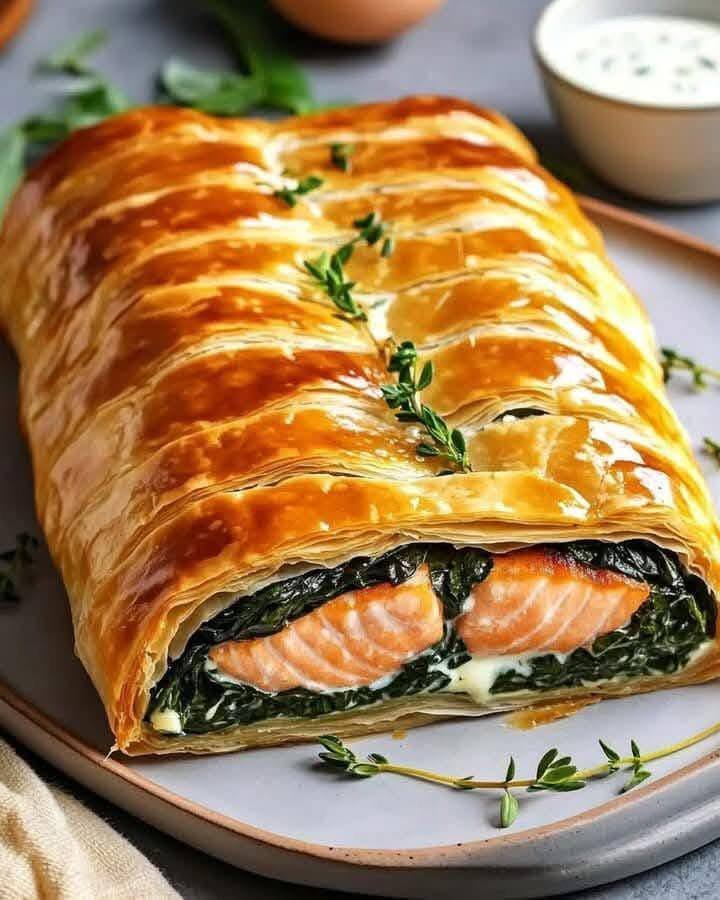 Salmon Wellington is a luxurious and flavorful dish featuring tender salmon fillets wrapped in a golden, flaky puff pastry with a creamy spinach and cheese filling. This dish is perfect for special occasions, dinner parties, or when you want to impress with minimal effort. The combination of rich salmon, buttery pastry, and savory spinach creates an elegant yet easy-to-make meal.