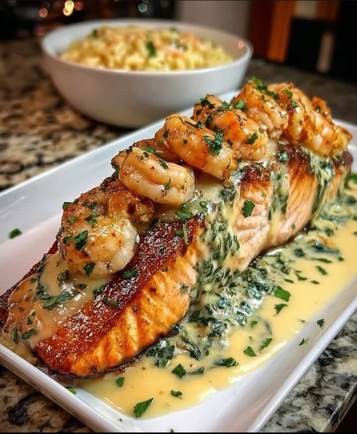 Here’s a rich, restaurant-style recipe for Salmon with Shrimp Cream Sauce—perfect for a special dinner but simple enough to make at home.
