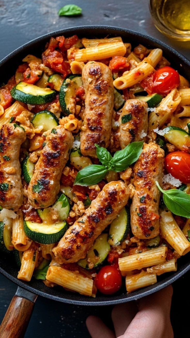 is a hearty yet light Mediterranean-style meal. Juicy chicken sausages are seared to perfection and tossed with tender pasta, sautéed zucchini, and a vibrant tomato-garlic sauce. It’s a one-pan dinner that brings together protein, veggies, and classic Mediterranean flavors — perfect for lunch or dinner.