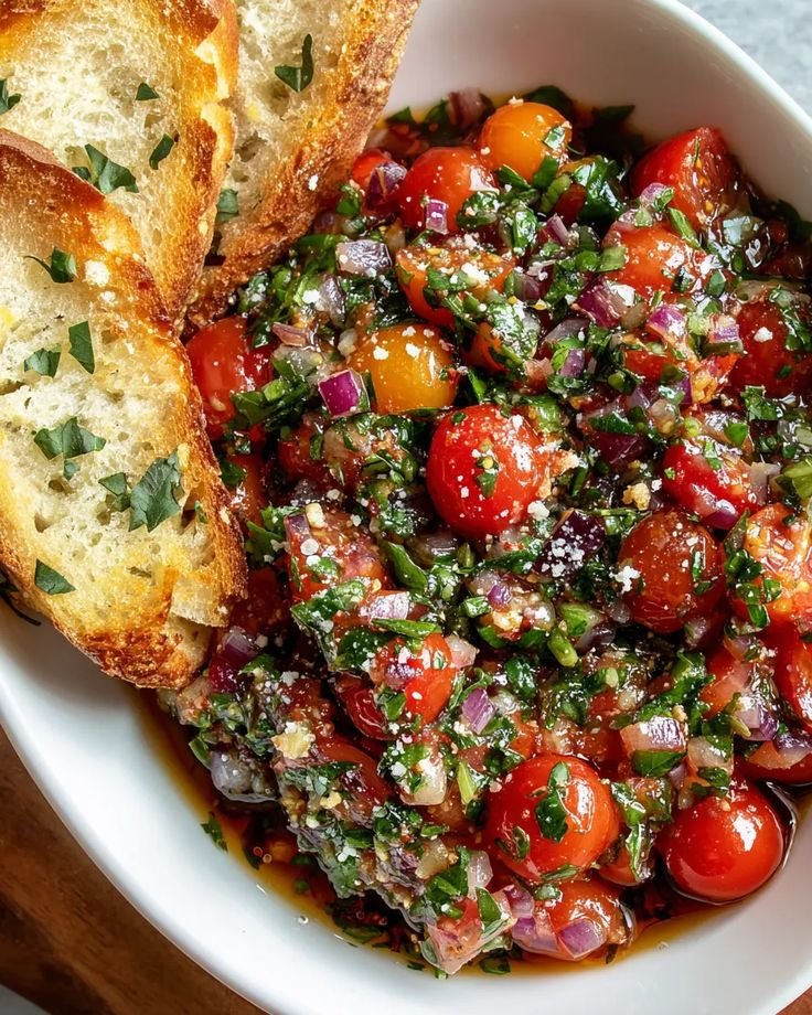 A vibrant bruschetta-inspired dip made with ripe tomatoes, fresh herbs, garlic, and extra-virgin olive oil, finished with a touch of balsamic. This Mediterranean-Italian classic is fresh, savory, and perfect with toasted bread, crackers, or veggies.