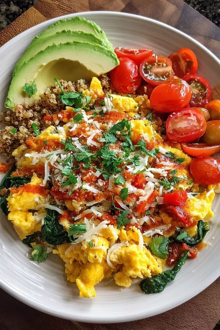 A comforting bowl of fluffy quinoa topped with sautéed spinach, soft-boiled egg, creamy avocado, cherry tomatoes, and a light lemon-herb drizzle. Balanced, hearty, and energizing.