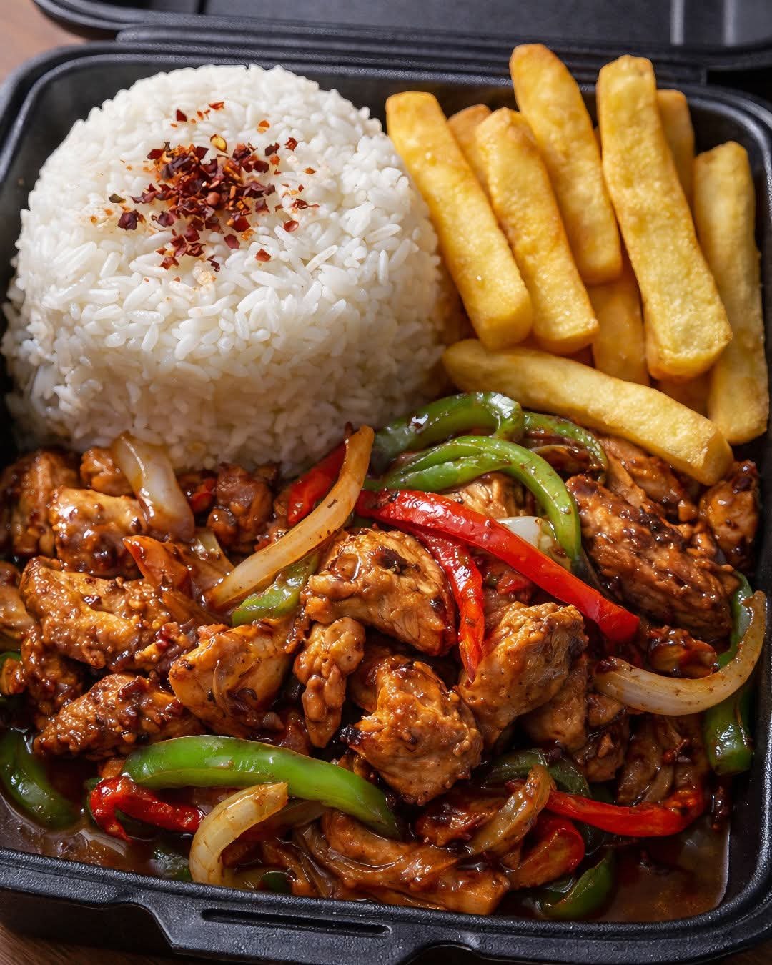 A bold, satisfying all-in-one comfort plate—juicy stir-fried protein and veggies, fluffy rice, and golden crispy fries on the side. This is non-spicy, customizable, and perfect when you want a hearty, crowd-pleasing meal.