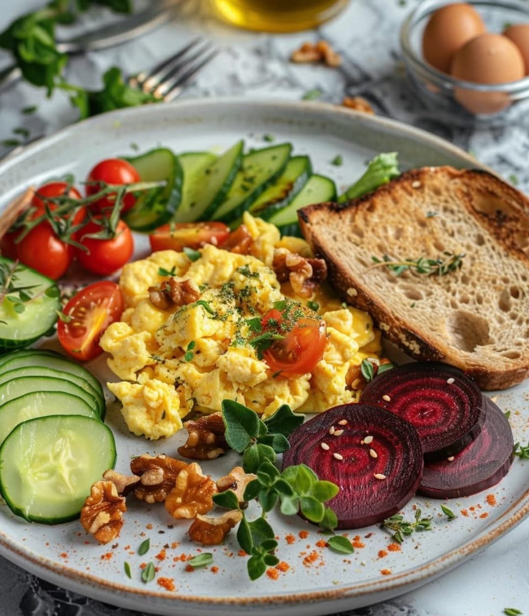 A Scrambled Eggs Breakfast Plate is a classic, protein-packed meal that provides a balanced start to the day. Fluffy scrambled eggs are paired with toast, crispy bacon or sausage, fresh vegetables, and fruit for a complete and satisfying breakfast. This meal is customizable, making it perfect for any dietary preference.