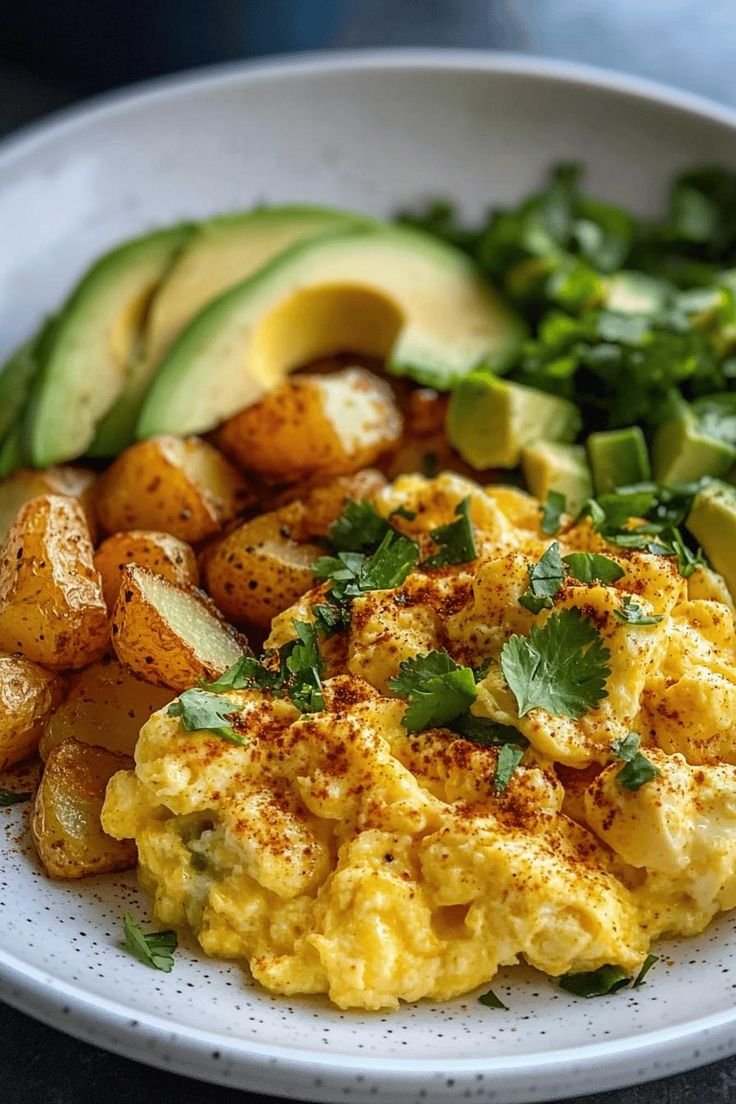 This comforting yet nourishing dish features fluffy scrambled eggs, golden crispy potatoes, and creamy avocado. It’s naturally high in protein, rich in healthy fats, and balanced with Mediterranean-style flavors—simple ingredients, big satisfaction.