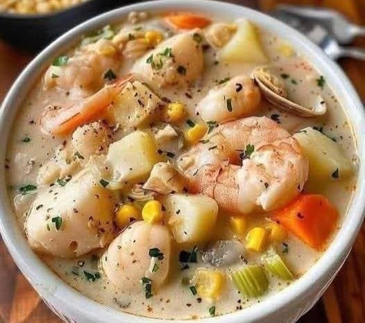 This hearty seafood chowder is creamy, comforting, and packed with the flavors of the sea. A combination of shrimp, fish, and clams (or your choice of seafood) mingles with tender potatoes, sweet corn, and aromatic herbs in a rich, savory broth. Perfect for chilly days or when you’re craving something cozy and satisfying.