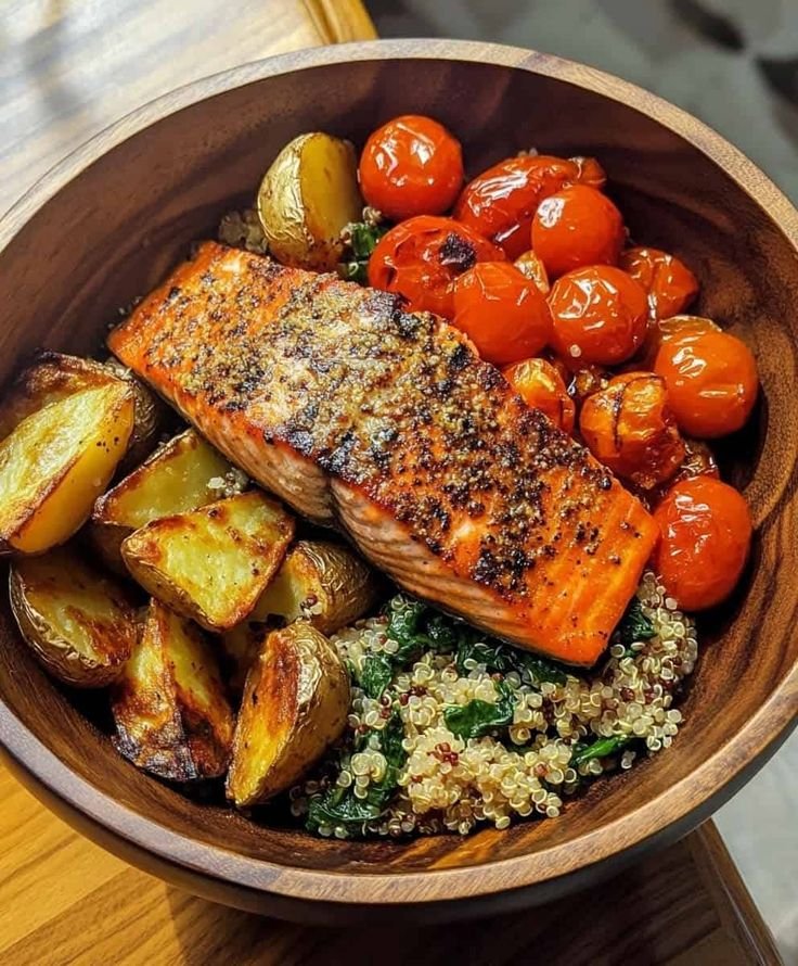 A vibrant Mediterranean bowl featuring crispy-seared salmon, roasted sweet potatoes, fresh greens, and a lemon-tahini drizzle. This bowl is rich in omega-3s, fiber, and high-quality protein, making it ideal for a healthy lunch or dinner.