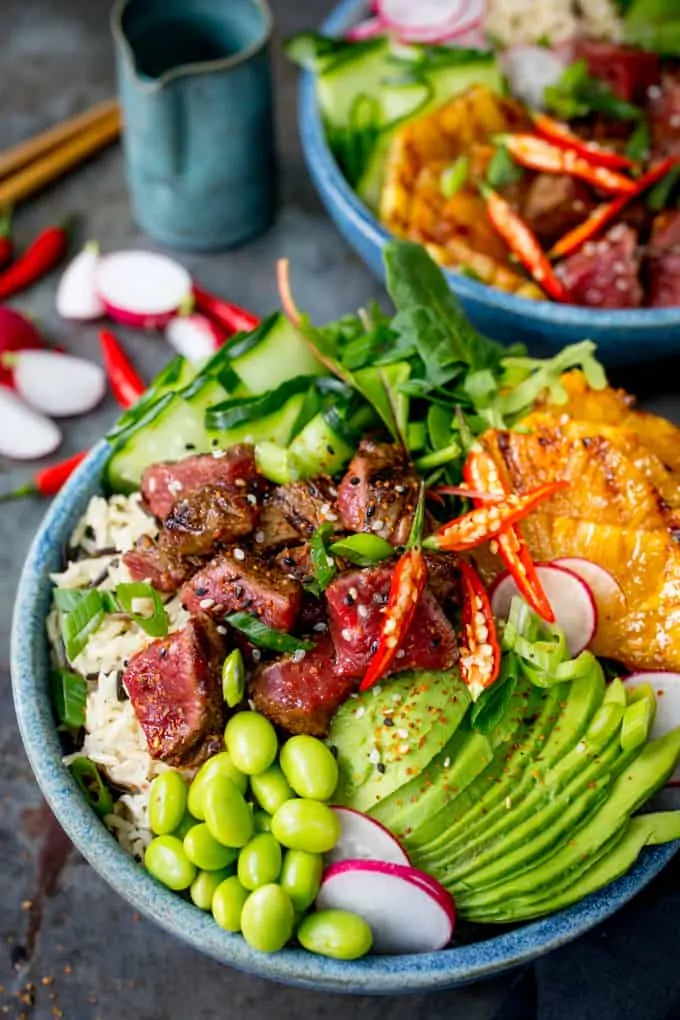 In this seared steak poke bowl, the richness is retained but the dish is made lighter!