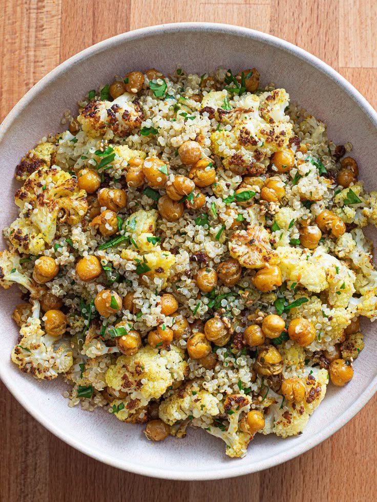 In a large bowl, combine quinoa, roasted cauliflower, cherry tomatoes, cucumber, and parsley
