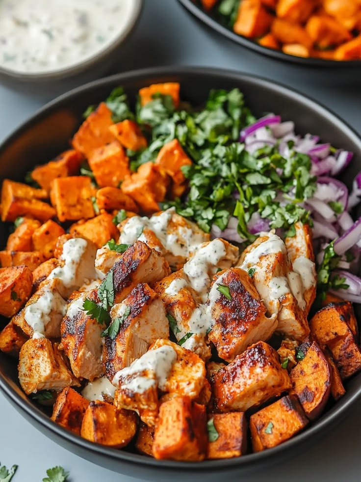 Sheet Pan Buffalo Chicken & Sweet Potato Bowl