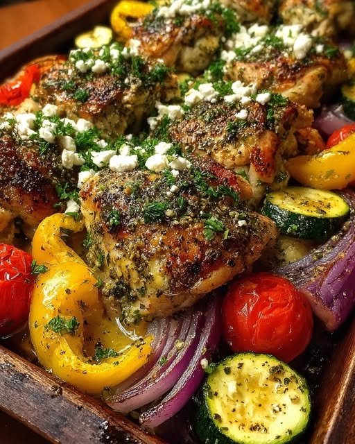 Sheet-Pan Lemon Chicken with Roasted Vegetables & Feta is a simple yet flavorful dinner that comes together on a single pan—perfect for busy weeknights or relaxed weekend meals. Juicy chicken is roasted with colorful vegetables, bright lemon, garlic, and herbs, then finished with creamy feta cheese for a satisfying, wholesome dish with minimal cleanup.
