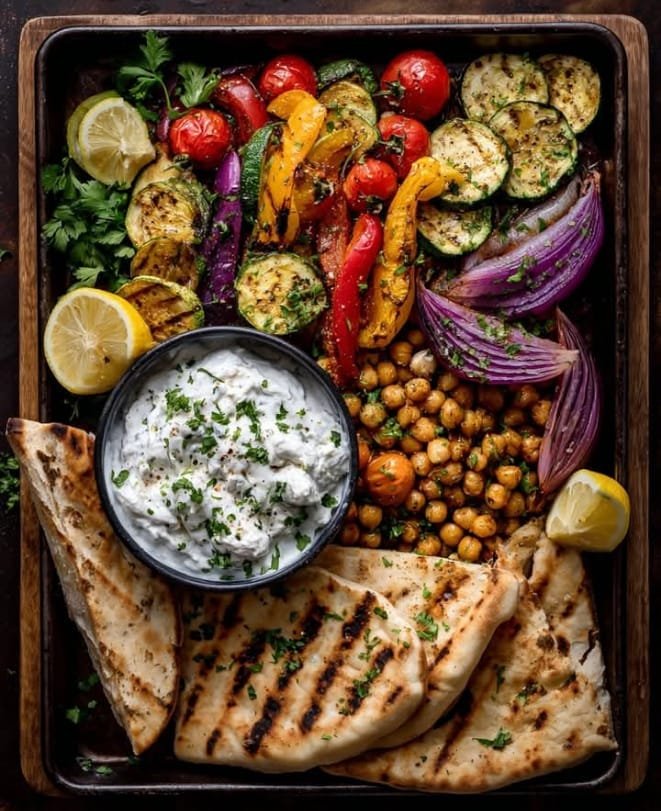 This colorful, nutrient-packed dish is a delicious and easy vegetarian meal perfect for lunch, dinner, or meal prep. Roasted vegetables caramelize beautifully on a sheet pan while a creamy, refreshing tzatziki sauce balances the warm flavors with a cool, tangy bite. Naturally gluten-free, this dish can be enjoyed as a main course or a hearty side.