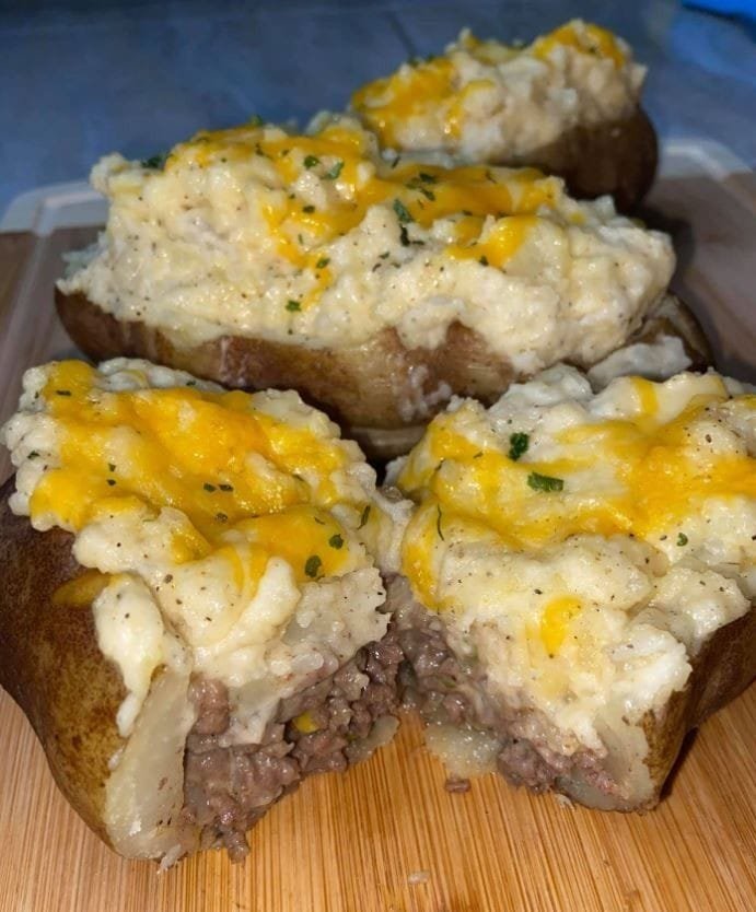 6. Top each potato with beef mixture and sprinkle with cheddar cheese.
