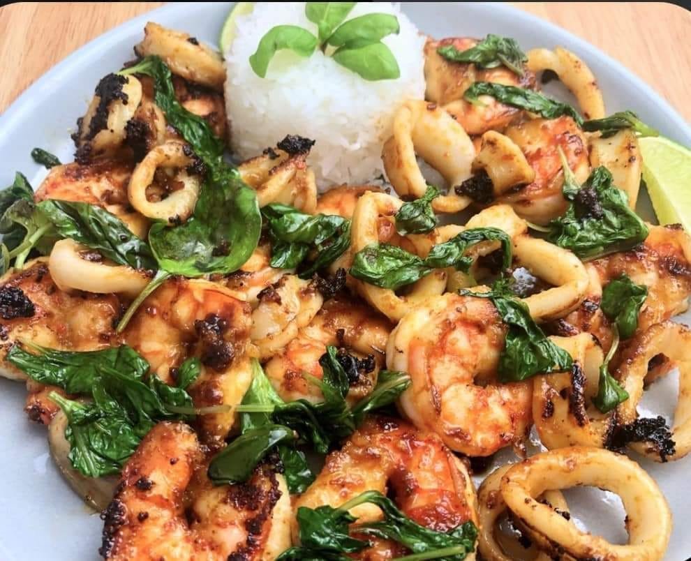 - Basil that has wilted should be added to the prawns and calamari using tongs. After that, make use of a spatula to scrape up as much of the delicious caramelised brown bits that are still in the pan and add them to the dish. This dish may be served with rice and lime wedges, if preferred.