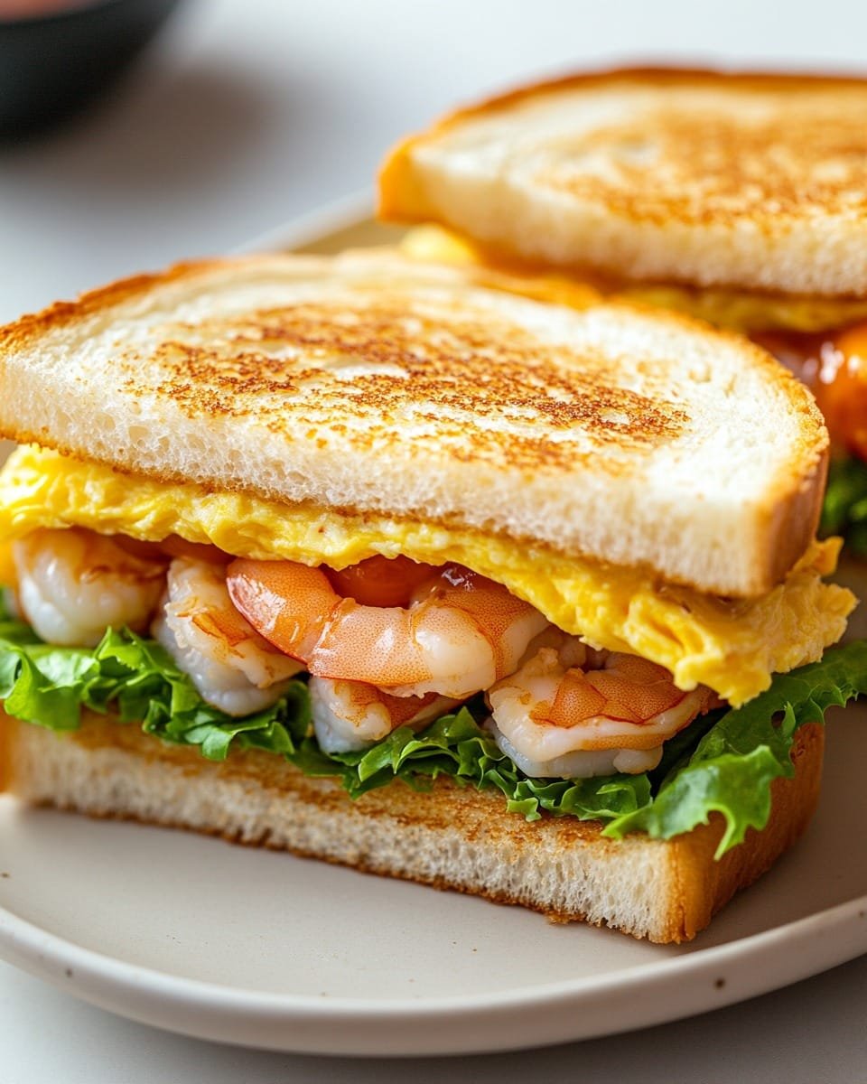 Once the bread is toasted, layer on the cooked shrimp, followed by the egg. If you’re adding cheese, place a slice of cheese on top of the egg while it’s still hot to melt.