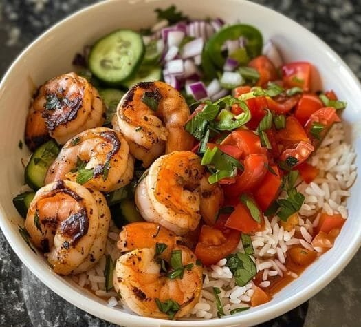 Indulge in the vibrant flavors of the Mediterranean with this mouthwatering Shrimp and Rice Bowl, expertly combining succulent shrimp, fluffy rice, and an array of colorful vegetables, all tied together with a zesty lemon-herb dressing.