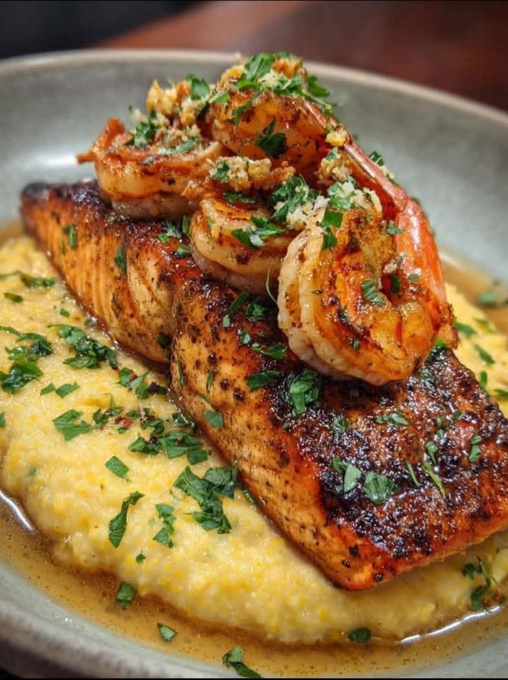This dish is a luxurious twist on classic Southern shrimp and grits. Creamy, buttery, cheddar cheesy grits are topped with tender blackened salmon and juicy shrimp cooked in a smoky, garlicky butter sauce. Every bite blends creamy, spicy, smoky, and savory flavors — perfect for brunch, weeknight dinner, or a special treat.