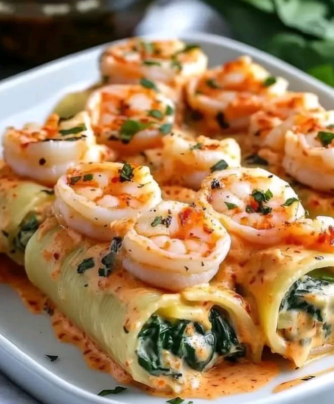 This elegant and flavorful dish features tender pasta sheets or lasagna noodles rolled up with a creamy filling of shrimp, sautéed spinach, ricotta, and Parmesan. The rolls are baked in a velvety roasted red pepper cream sauce, adding a subtle smoky sweetness that complements the seafood perfectly. Garnished with fresh herbs, this dish makes for a beautiful main course, perfect for special occasions or a refined weeknight dinner