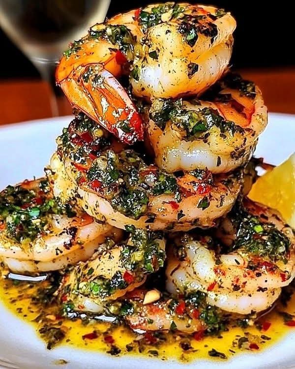1. Arrange the cooked shrimp on a plate and drizzle generously with chimichurri sauce.