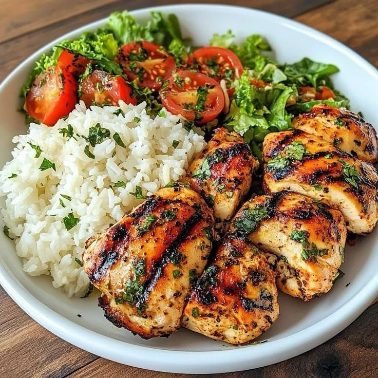 Tender, well-seasoned grilled chicken served with fluffy rice and a crisp, refreshing salad. Easy, clean ingredients, and naturally healthy — great for meal prep too.