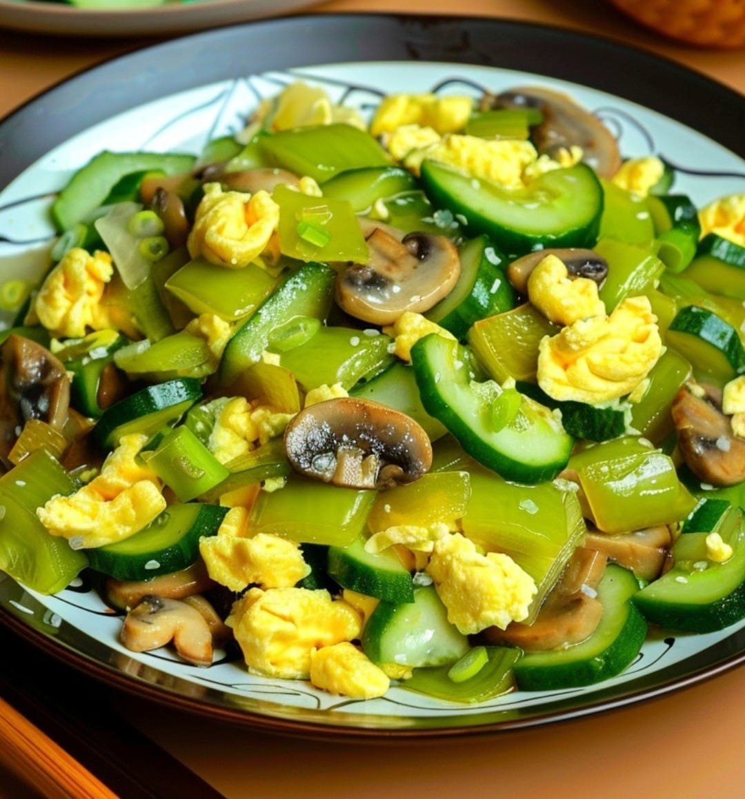 Simple Cucumber Stir-fry with Egg and Mushroom A fast, wholesome, and delectable recipe, cucumber stir-fry with egg and mushroom combines the richness of eggs, the umami flavour of mushrooms, and the refreshing taste of cucumber. This stir-fry is a great addition to your meal repertoire since it’s simple to make and packed with nutritious ingredients, making it ideal for a light lunch or supper.