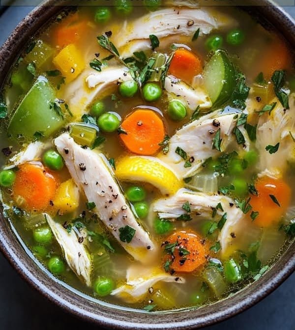 This light and refreshing lemony chicken soup is packed with vibrant spring vegetables like peas, carrots, and bell peppers, making it a perfect healthy meal for any season. The bright citrusy flavor from fresh lemon juice pairs beautifully with tender shredded chicken and aromatic herbs. It’s a quick and easy recipe that’s comforting yet light—ideal for a cozy lunch or dinner!