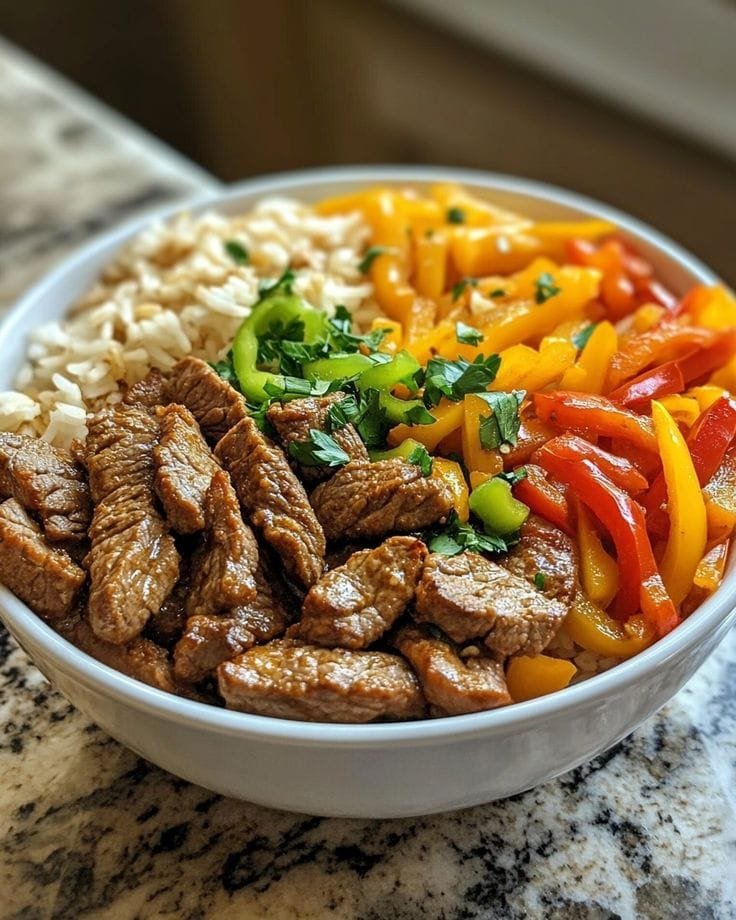 This sizzling bowl features thinly sliced beef, colorful bell peppers, onions, and a garlicky soy-based sauce, all stir-fried until caramelized and served hot over steamed rice. Think of it like a healthier take on takeout — quick, flavorful, and deeply satisfying.