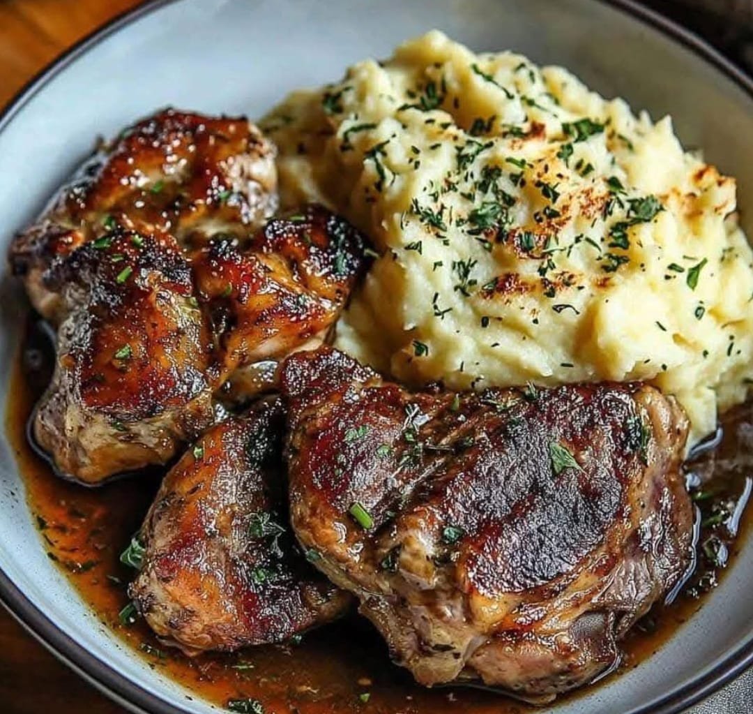 This hearty dish features tender, slow-cooked garlic-infused chicken and juicy ribeye steak, served alongside crispy, cheesy Parmesan potatoes. The slow cooking process ensures deep flavors and melt-in-your-mouth texture, making it a perfect comfort meal for special occasions or a satisfying family dinner.
