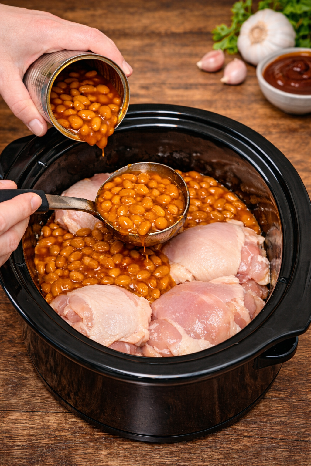 A hearty, one-pot slow cooker meal where juicy chicken thighs cook low and slow in rich, smoky baked beans. The flavors blend into a sweet, savory, and slightly tangy dish that’s incredibly easy and satisfying.