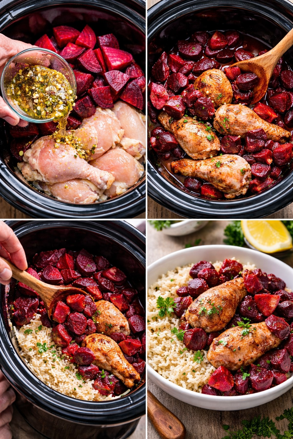 This Slow Cooker Chicken & Beetroot Delight is a unique, rich, and flavorful dish where tender chicken slowly cooks with earthy, slightly sweet beetroot. The result is juicy chicken infused with deep color and natural sweetness, balanced with savory spices—perfect for a comforting and nutritious meal.