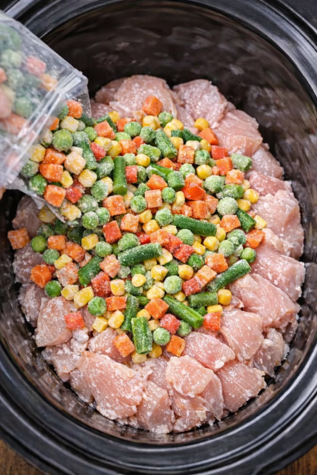 A simple dump-and-go slow cooker recipe made with chicken and frozen mixed vegetables. This hearty comfort meal requires minimal prep and slowly cooks into a flavorful, tender stew perfect for busy days.