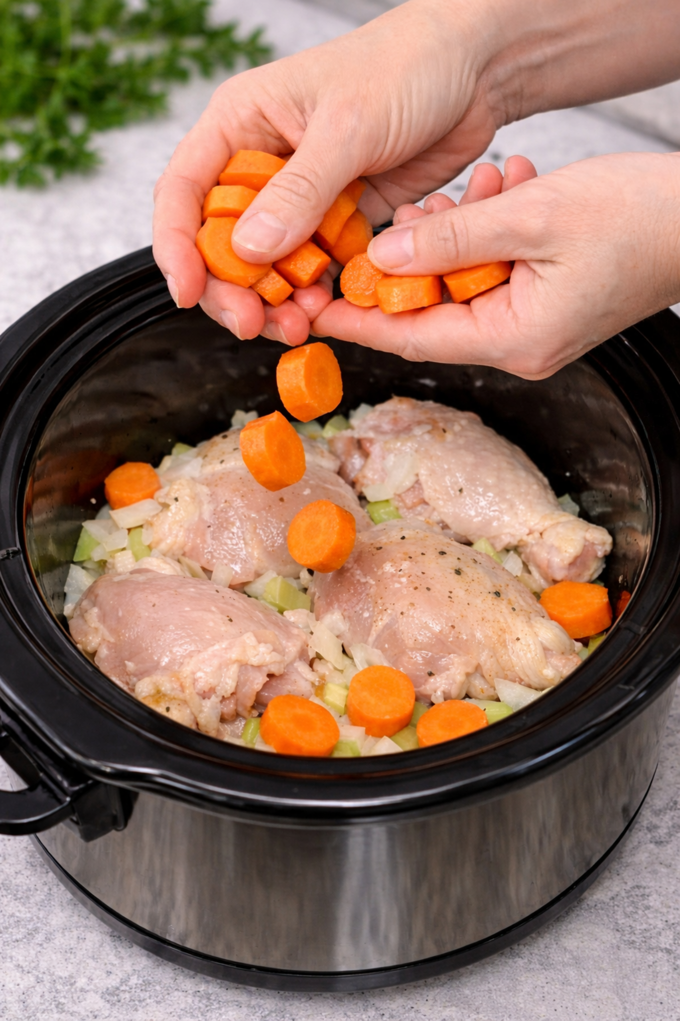 - Add chopped onions, celery, and garlic to the bottom of the slow cooker.