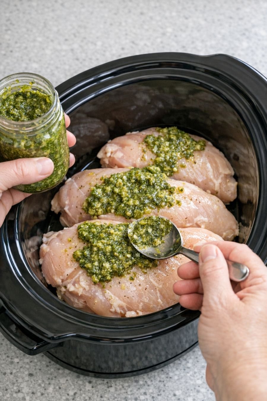 A flavorful and effortless slow cooker dish where tender chicken breasts are coated in rich basil pesto and slowly cooked until juicy and aromatic. This recipe is perfect for busy days and requires minimal preparation.