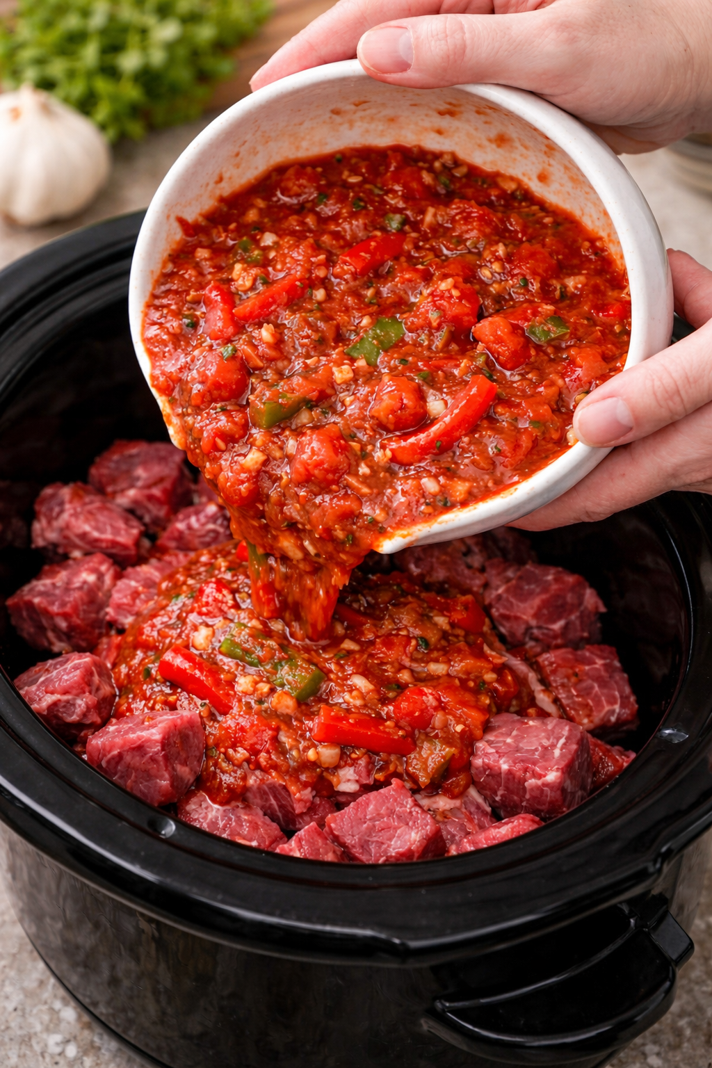 🥩 Slow Cooker Savory Beef Stew with Tomato Pepper Sauce