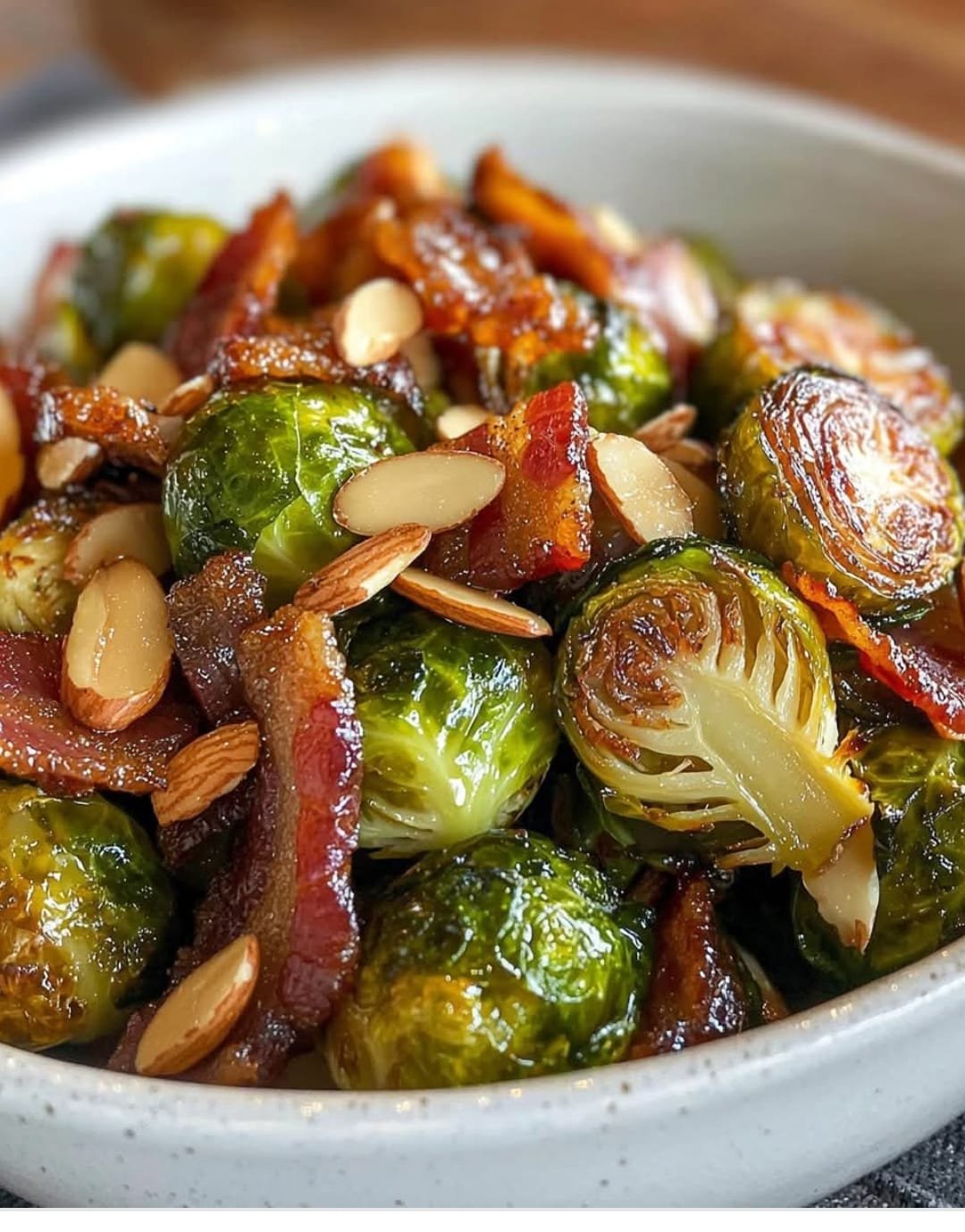 Smoky Bacon Lardon Brussels Sprouts with Maple Glaze & Toasted Almonds